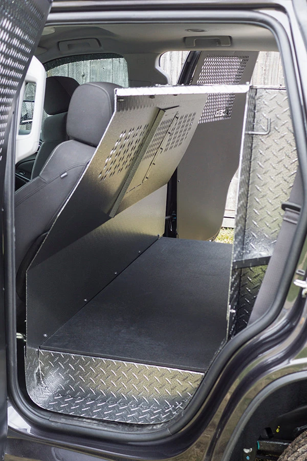 Police K-9 only Vehicle Insert Chevrolet Tahoe 2015 – 2020 is a transport for the K9. The design allows the dog to enter or exit from either side of the vehicle and from the rear. Made from heavy duty diamond-plate aluminum with a durable & beautiful glossy black/silver vein powder coat finish. CNC cut ventilation holes are found on both the front and back panels of the K9 area to allow excellent air-flow, and also let you interact with your K9 partner. There is a (Ventilation Adapter Kit #992063) for attaching the A/C unit, which is sold separately. Comes with rubber floor mat for easy cleaning. Has step for K9 if the K9 gets tired.