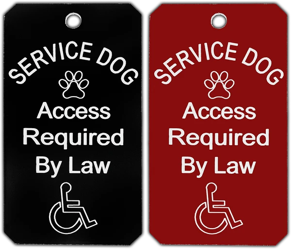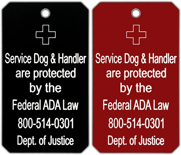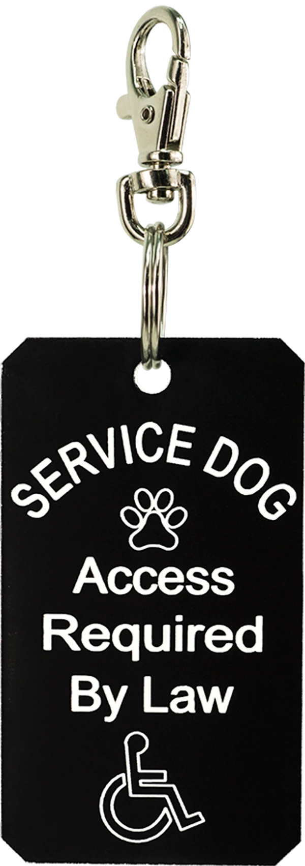 Our Large Engraved Service Dog ID Tag is engraved on both sides with service dog and handler identification. It is made from red or black acrylic with white recessed lettering. Easily attach to your dog’s vest, your jacket, handbag, etc. with the snap clip and ring.