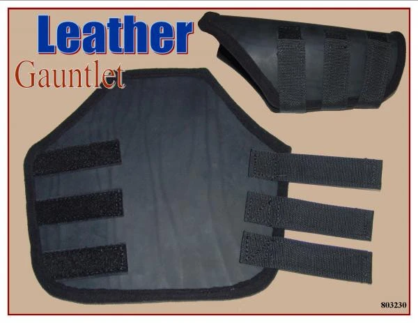 This is a significant Leather Gauntlet. It is made from thick, 11oz. latigo leather. Latigo leather is a durable, flexible leather. It is dyed solid all the way through, so it will not fade. Because of the conditioners that are infused with oils during the process latigo leather is almost waterproof. It will not dry out like most harness leather. It can be easily cleaned and oiled after use.