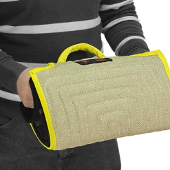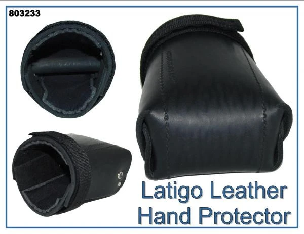Hand protection with a interior grab bar. The Leather Hand Protector is like a hard leather mit of protection. The Leather Hand Protector is made of thick, latigo leather and is padded on the interior for comfort. The grab bar (inside the hand protector) and the adjustable Hook and Loop strap (around the wrist area) help to keep the hand protector in place. It can be used on right or left hand. Can be used with the bite suit or bite sleeve during training to protect the fingers/hand.