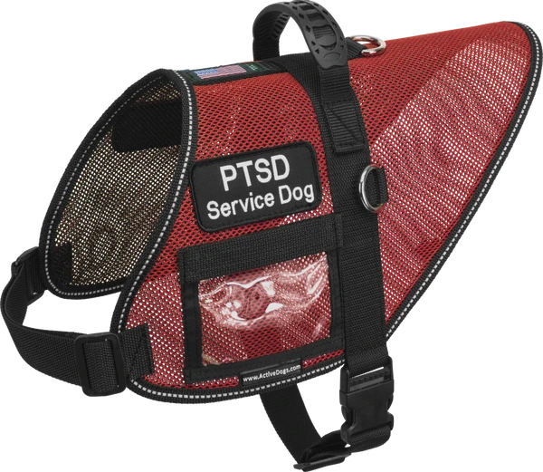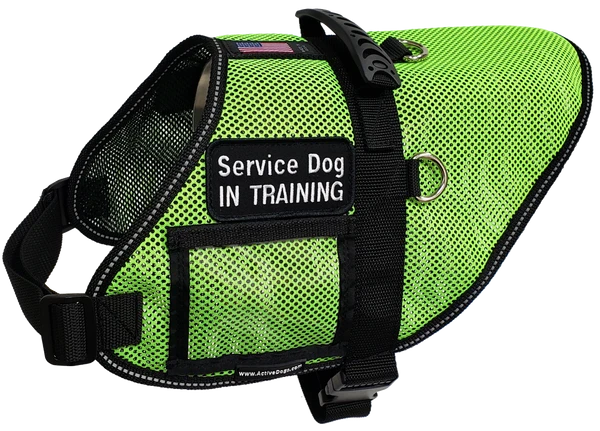 The Mesh Vest with Handle is done in the same style as our S&R Style Harness Vest and will fit your dog in the same way. This is a great vest as it has all the same features with the comfort of air breathing mesh fabric. A great vest for summer and for dogs that need to work in the heat. The Mesh Vest w/Handle features additional side D-rings for using the bridge handle (sold separately). The shorter attached handle is made from easy grip molded rubber materials. There is a clear vinyl pocket for your ID or other important papers on the side of the vest. The entire Mesh Vest w/Handle is bound in reflective webbing for night safety. On top of the vest, there is a heavy welded D-ring for attaching your leash. The chest strap has a two-way adjustment. The girth strap is adjustable and allows your dog the mobility that it needs to work, run, and jump. Comes in 9 colors, red, blue, black, coyote brown, yellow, pink, aqua, lime, orange. This vest comes in four sizes. MADE IN THE USA