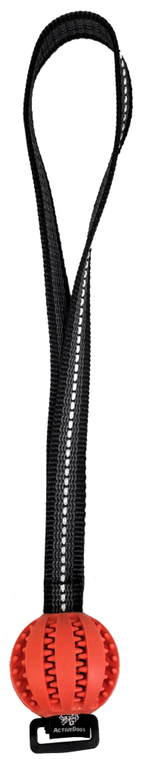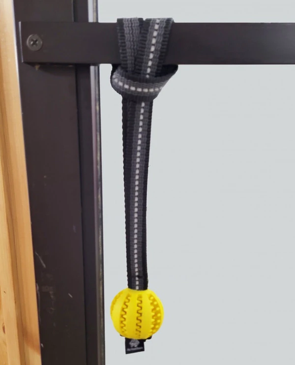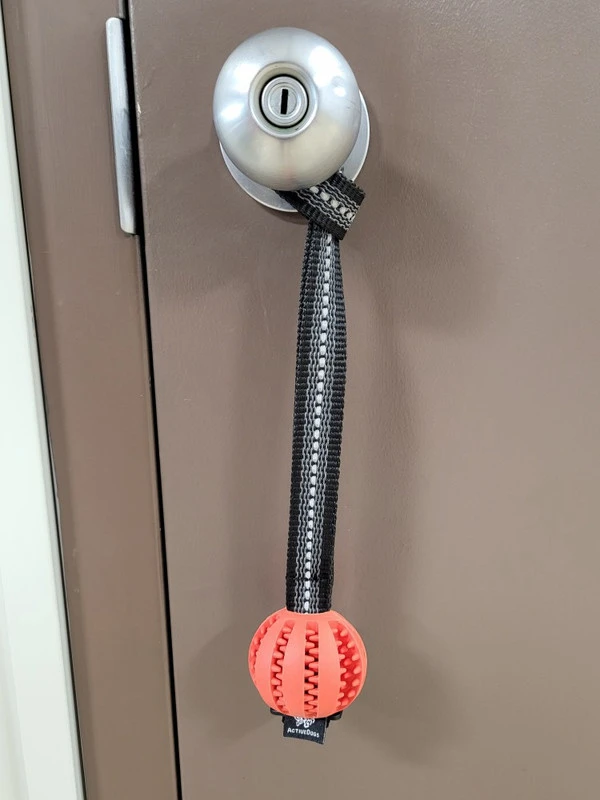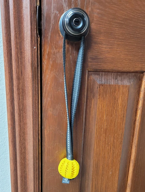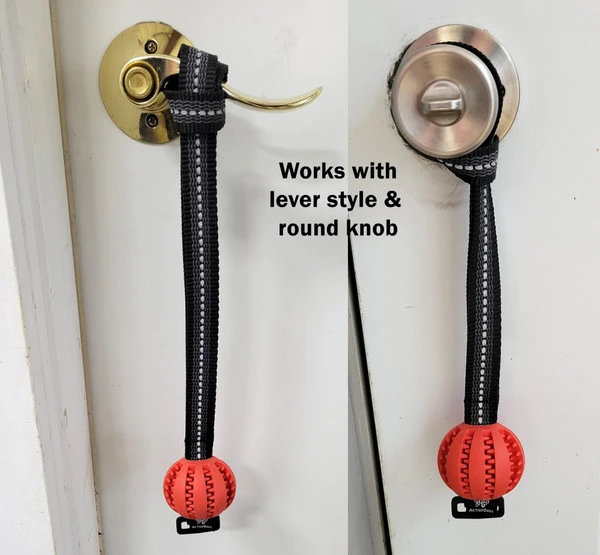 This simple little tool has quickly become one of my favorites. It easily fits in a pocket and I generally have one with me when working a dog. The dog likes the size and ease of this rubber ball with knobby teeth in it. The webbing that is attached to the ball is also rubberized. This is not slippery if the dog catches the webbing instead of the ball when opening a door or pulling a drawer open. Because of the rubberized webbing the ball grips nicely around any object you attach it to, doors, drawers, etc.