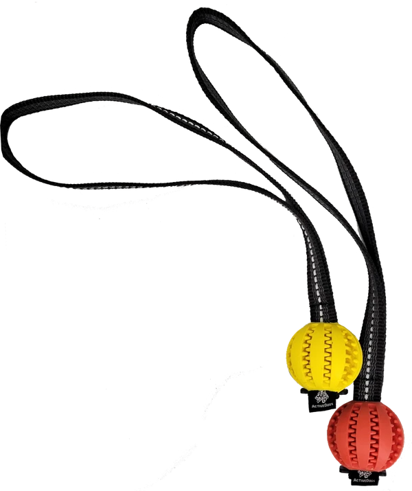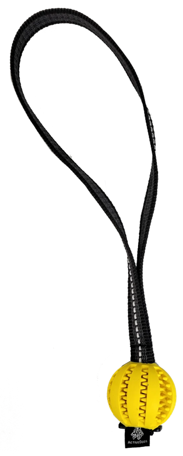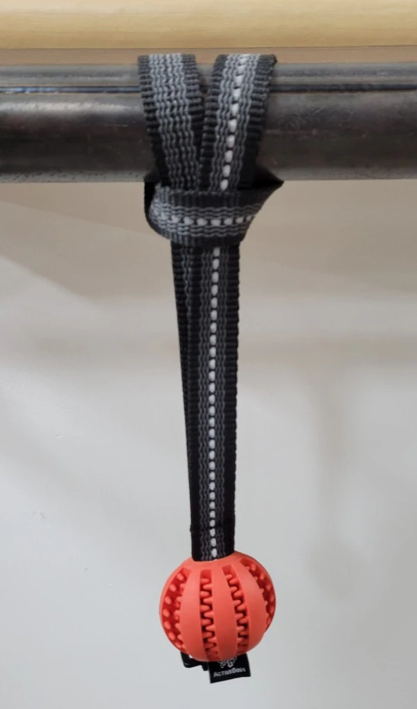 Another place I’ve used this is in training a dog to bring me an object they don’t like in their mouth, such as metal keys. So when I am training the dog to bring me those metal keys I’ll start with looping this around the key ring until the dog gets used to the clanging keys. The ball can be used as motivation because dogs love that reward ball.