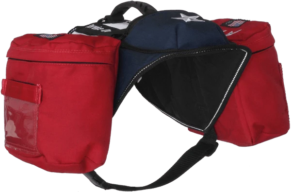 A beautifully embroidered vest-harness with two removable side bags and a petite top pouch. This is a super functional pack carrying dog vest-harness for your working dog. The features are many and the versatility of this Patriotic Tri Pack Vest is multi-functional. You have the look of a highly visible dog vest with the benefit of a harness. This patriotic Tri Pack Vest is done in a Red, White, Blue color scheme with beautifully embroidered silver stars on all three of the packs. The vest is padded for comfort to your dog and both the chest and girth straps are adjustable. Added safety feature of the entire vest outline is done with reflective webbing. Like all of the activedogs.com dog vests it is composed of the highest quality materials having high thread count.
