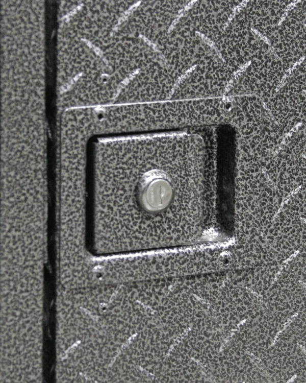 The top and bottom of the dog crate and the doors are polished, 1/8″ thick diamond plate aluminum. The door is laser cut, double reinforced, and features a stainless steel, locking door latch with one key. The door can be latched with or without locking it.