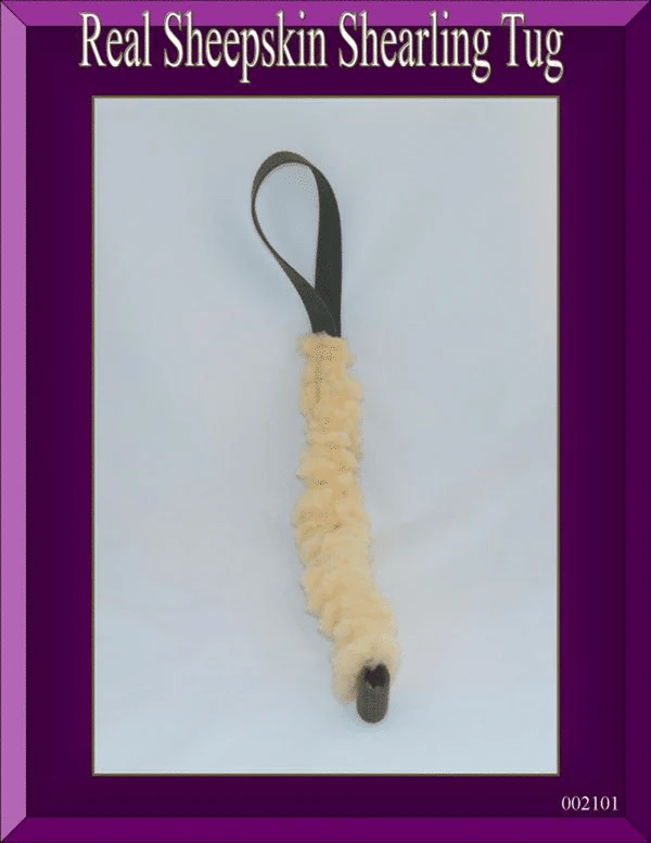 This training tug has a dual purpose as a motivational dog training tug and it can also be used as an assist dog training tug or a tool for the handler to open doors. Our natural Shearling training tug is made from real sheepskin. It is soft on the dog’s mouth but very strong as we have stitched it onto heavy cotton webbing. I like the natural non slippery woven cotton webbing handle as it gives a firm grip. This large size loop handle is big enough so the tug can function as training and operating aid for a disabled handler. The tug handle can be placed over door knobs or handles to aid in opening doors. Overall length of this tug is 24 inches.