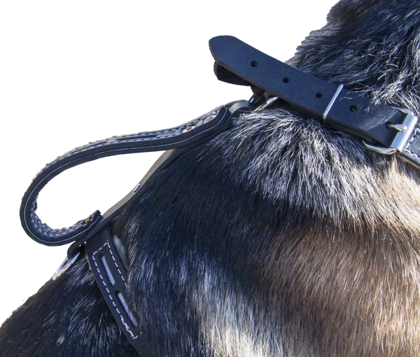 This harness has everything for a true all day working harness. I have used my harness like this for 20 years. I’ve used it to do a pedal bike endurance title, to do agitation work, and many other tasks. The handle is just where you need it to be. The thick real sheepskin will become a little more condensed as times goes on and the leather more flexible. As time goes by and the harness breaks in you can adjust by placing the straps to a tighter position. Offered in four sizes. Made in the USA by Activedogs.com craftsman.