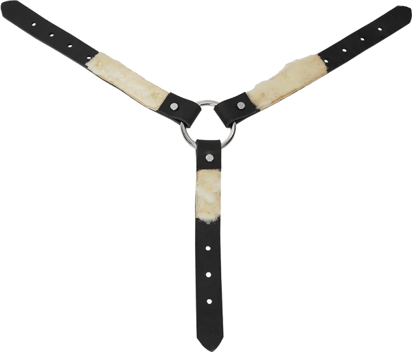 The front chest pad and straps are lined with real sheepskin padding for the maxium comfort. Reflective material is used throughout the entire harness for optimal visibility. The chest and girth straps are adjustable.