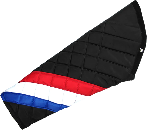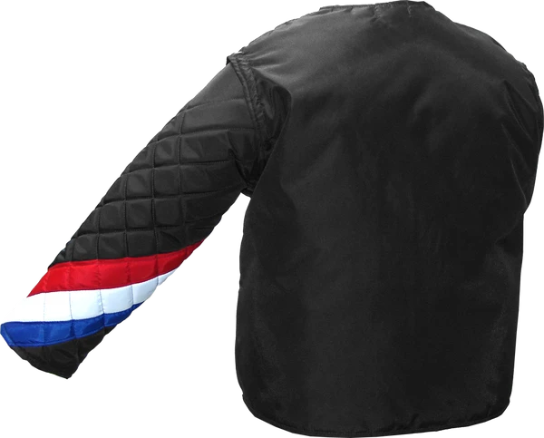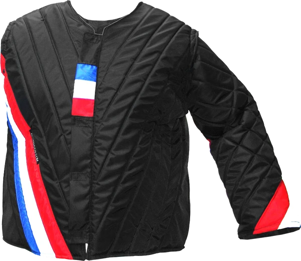 This scratch jacket is made from light weight oxford nylon for a strong, light, and super flexible jacket. It has a flashy color scheme that will match our scratch pants 8009619P. The coordinating pants are made from the same fabric and color scheme. The interior of this jacket and its sleeve have a quilted lining throughout. The jacket front and sleeve have added padding built into them for extra decoy protection to the body’s chest and arm. The jacket and sleeve are professionally quilted in a diagonal pattern. Jacket front has a zipper closures with zipper cover. The sleeve of this jacket can be worn on the right or left arm and attaches with hook/loop and Dura snaps. The jacket neckline is designed in a shallow V shape to give the decoy full neck movement. The colors of the jacket are black with red, white, and blue details. Four sizes available for this jacket and there is no extra charge for the larger sizes.