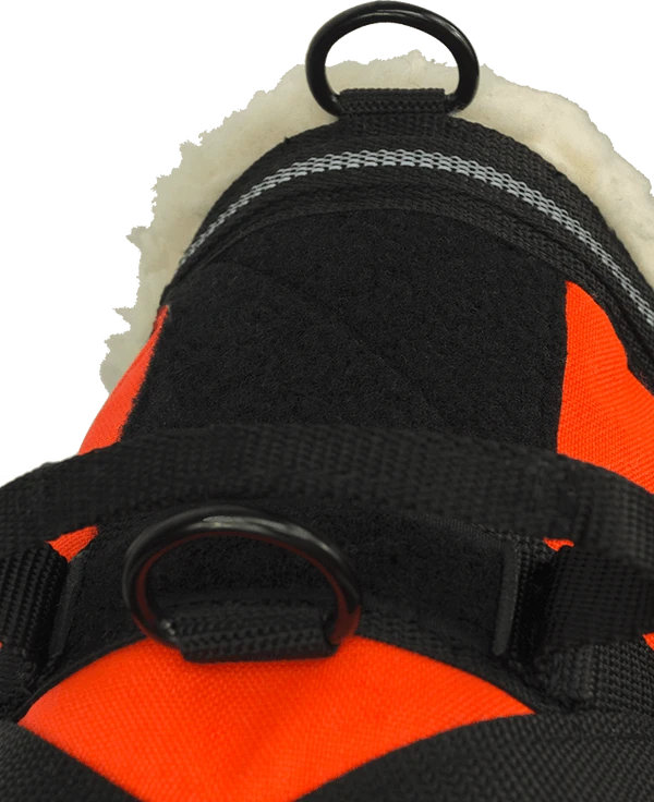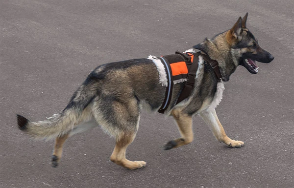 This chest pad protects the dog’s chest running through brush. A dog has its power in its chest and the pressure of the harness against its chest actually takes the stress off the girth straps when the dog is running and pulling against the line. The top of the harness has a handle that folds down and uses hook and loop to attach back onto the harness so it can be down when the dog is working and this style of handle will not as easily get caught on objects. The back plate of the harness is also padded with Sherpa for comfort on the dogs back. There is reflective webbing all around this harness for evening work. The S&R Hi Vis Double Girth Harness was designed to accommodate the activedogs.com GoPro camera mount (sold separately). This is a nice feature while working the dog during search work, building searches, and general training. In this harness we will still offer the traditional fluorescent orange fabric choice as well. Choose from Yellow/Lime or Fluorescent Orange colors.