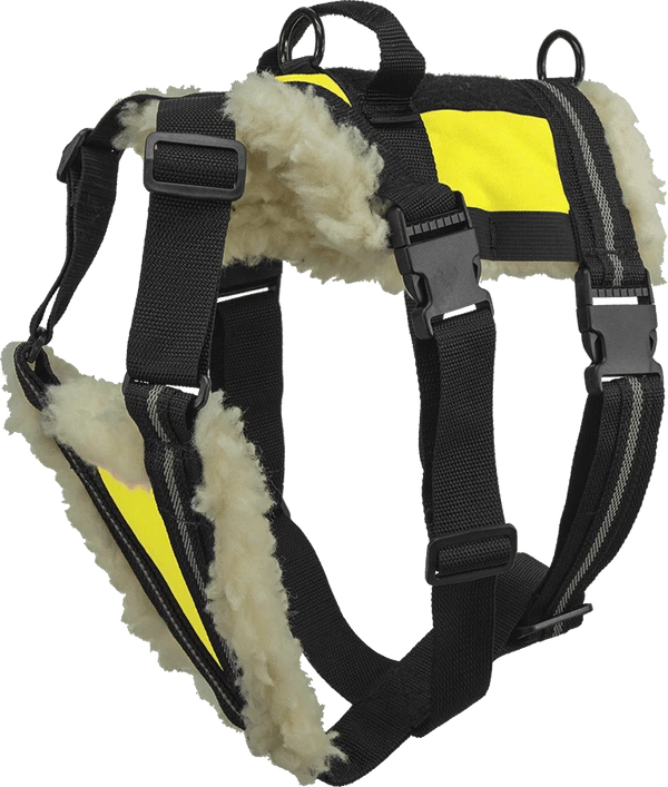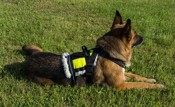 After working in search & rescue with one of my dogs, I realized that there was a need for a double girth harness that was made from the new highly visible yellow/lime fabric. You see this bright fabric used in road construction and nearly all dangerous work situations. In S&R work we wear this new bright yellow/lime color clothing. The S&R Hi Vis Double Girth Harness has several unique features that make it very functional for the working dog. This harness has two girth straps, this is a great feature making the harness more stable on the dog when tracking. The harness has two D-rings one on the neck area of the harness and the other on the back of the harness. When working a long line it can be attached to the back D-ring. This not only gives the dog better free movement but the line tends to tangle less around the dog because it is attached up on the lower part of the dogs back. The chest area has reflective webbing and is padded and lined with Sherpa.