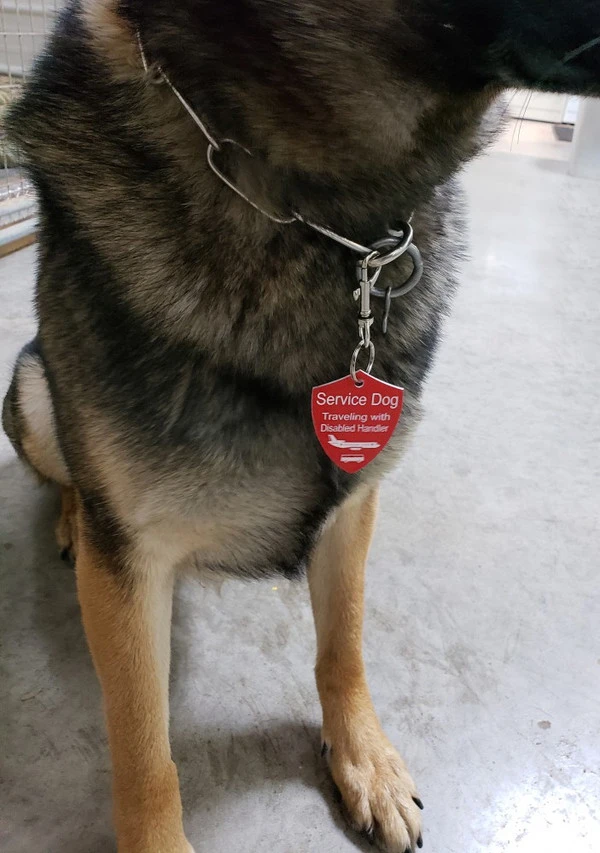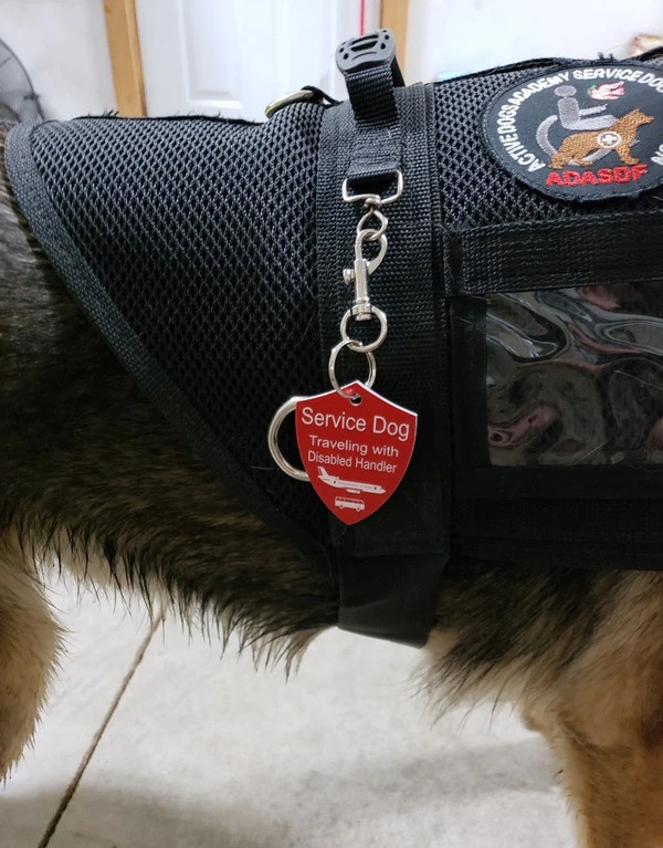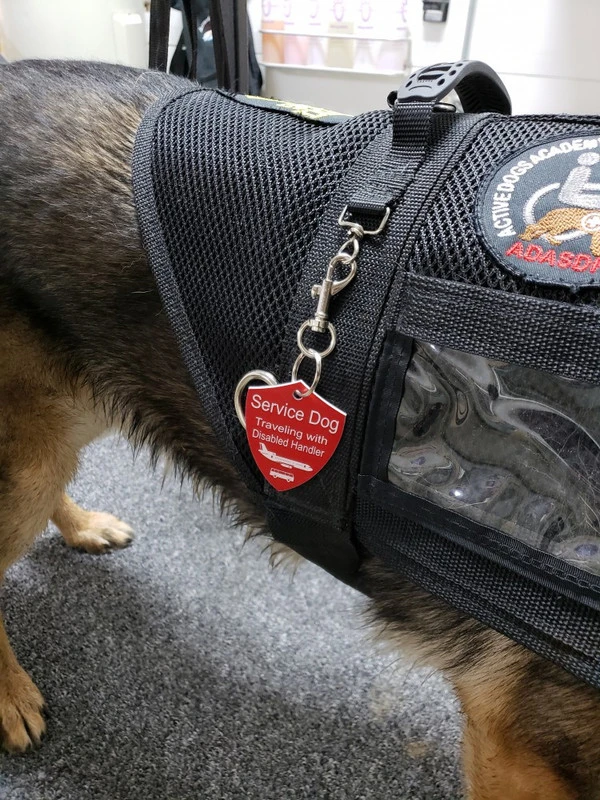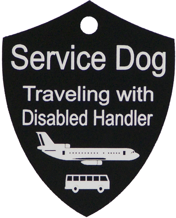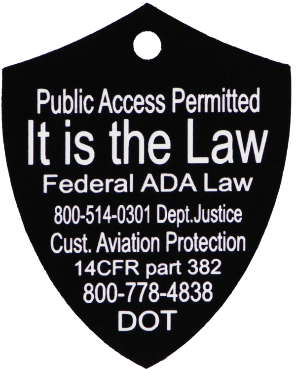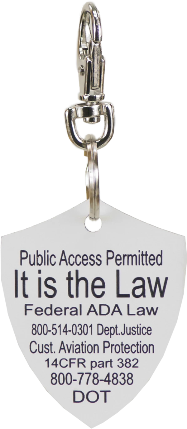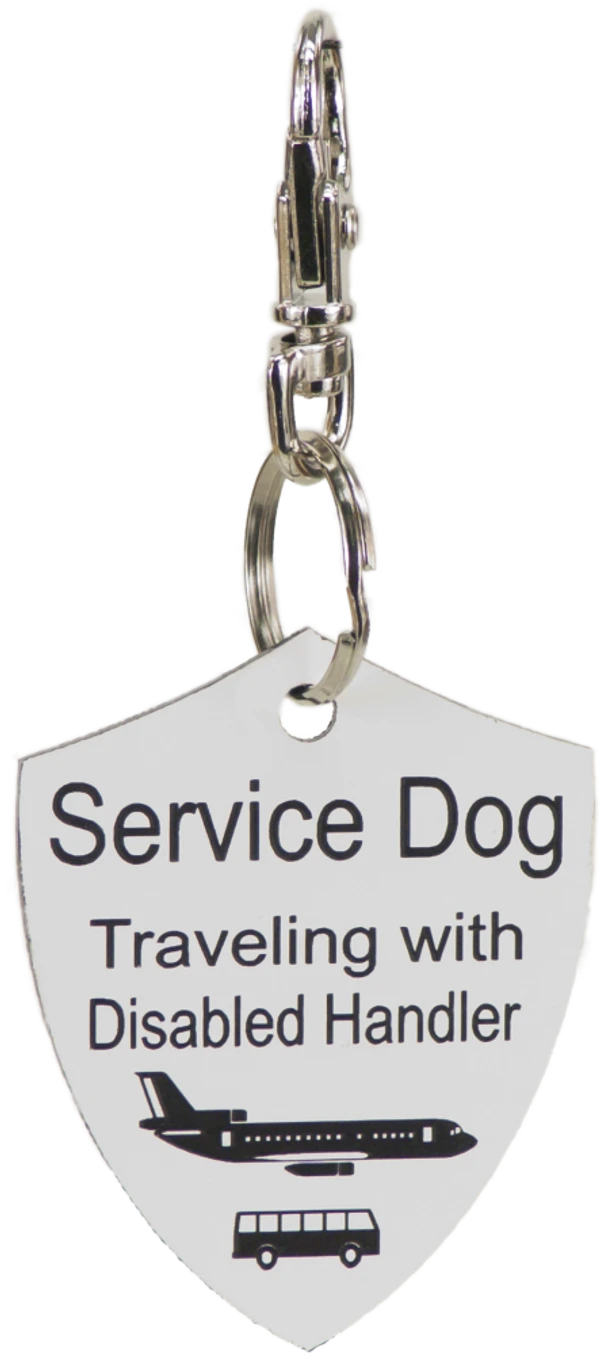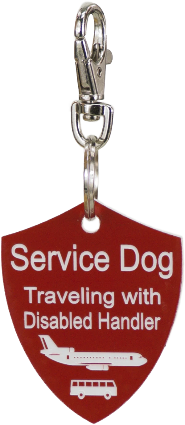 The Engraved Service Dog Travel Tags are perfect accessory when traveling with your service dog. The tags are a shield shape with engraving on both sides of the tag. The tag reads Service Dog Traveling with Disabled Handler on one side and ADA law on the other side. This tag come with a split ring and a easy to use chrome trigger snap, making this tag easy to attach or change locations if desired. The Engraved Service Dog Travel tag is approx 2″x2.5″ making it the perfect size to clip on any collar, vest, harness, or carrier. Made in USA