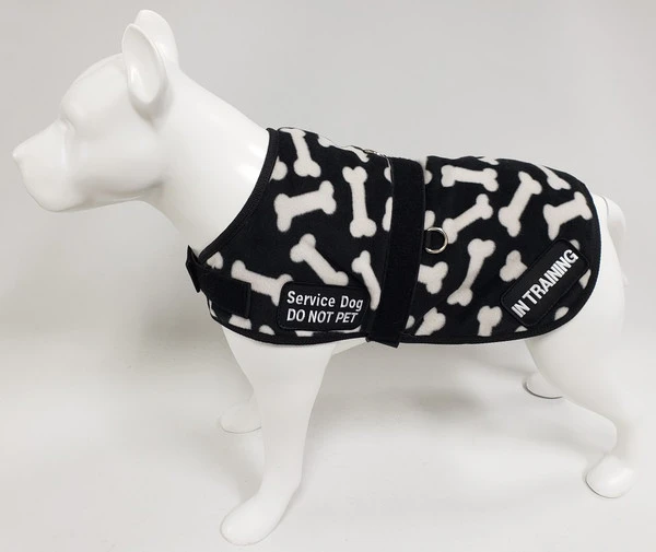 Our Service Dog Insulated Fleece Vest is great for chilly weather when your dog needs a little extra warmth but still needs to be identified as a working dog. This soft fleece vest comes in a variety of fun patterns and colors with five different sizes to choose from! This vest has a plush fleece exterior and is lined with a poly filled quilted nylon material to give your dog extra comfort and warmth. This quilted lining has a satin finish so the dog hair does not easily stick to it.