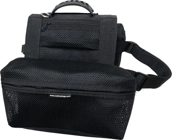 New redesigned features have been added to our Mesh Bag Vest Harness. This is a great harness style vest for carrying and transporting items that may hold moisture such as a dog water dish, water bottles, wet dog boots, towels, etc. This Mesh Bag Vest has two zippered side bags that have a solid back and bottom but, top, front and sides are constructed from a double layer mesh. This changed feature has strengthen the bags yet at the same time makes them easy to see into, light weight, and air can flow through the bags. The bags have dimensions of 3” Deep, 11” Wide and 6” Tall.