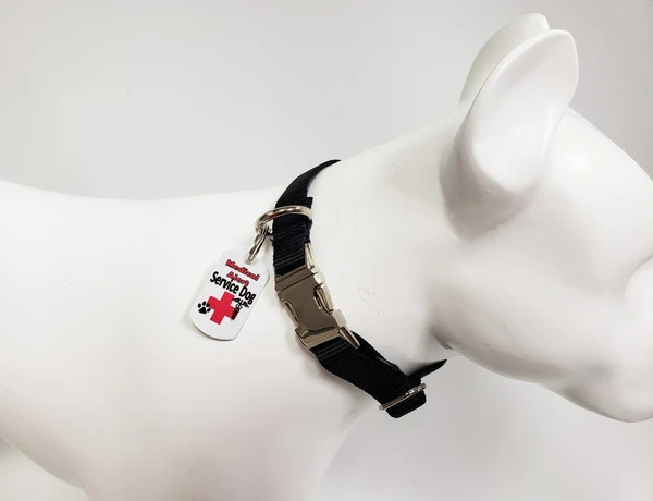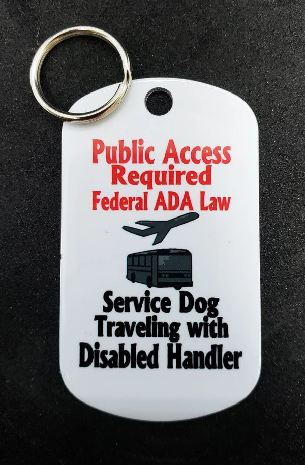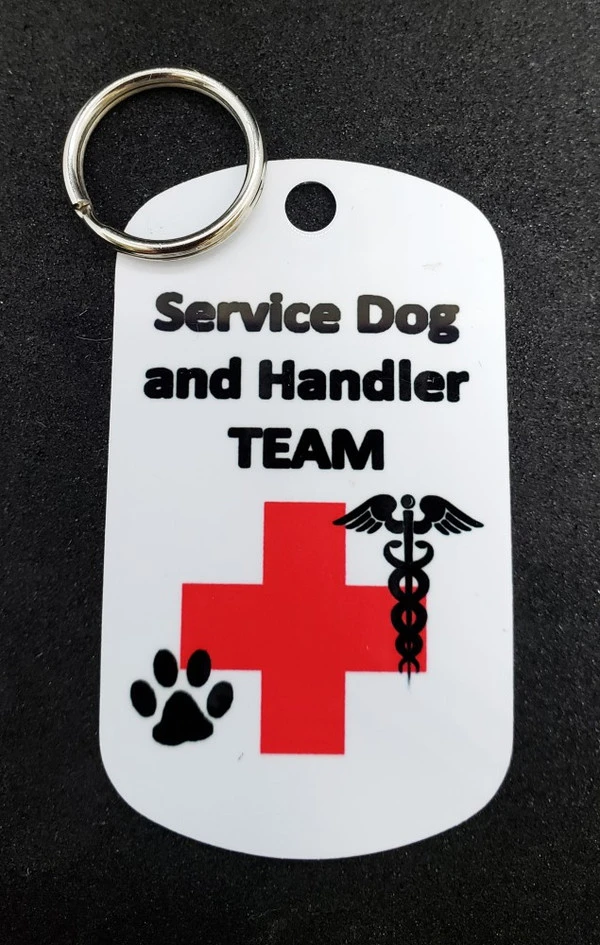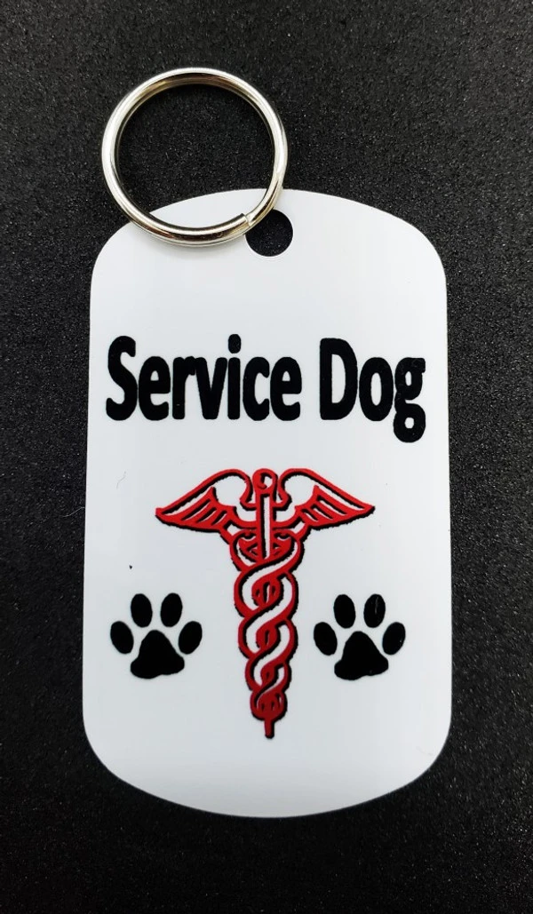 Our Metal Dog Tags are printed in color with permanent dye on a white background for high visibility. Each tag has a helpful message on it. This ActiveDogs Service Dog Identification Metal Tag is a high quality dual sided aluminum tag for people with a service dog. This aluminum dog tag is 1 7/8” x 1 1/8” in size and is available in 16 different designs. The tag comes with split ring and is a perfect size tag for working service dogs. It can also be worn on a bracelet, vest, pouch, collar or lanyard. Front of the tag is printed with the full color high quality & comes with split key ring. Design is printed on both sides of the tag. MADE IN USA
