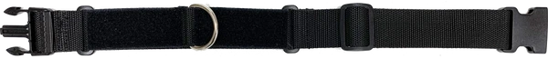 It is made of 1.5” thick webbing, it has a 1.5” black side release buckle that is adjustable. There is a welded metal D-ring in the center for attaching your leash.