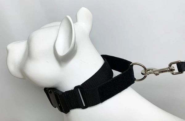 For the martingale no slip patch collar to work properly as a training collar, it must be well-fitted and worn secure around the dog’s neck. The collar should be worn high on the dog’s neck and sit just behind the ears. It should fit snugly, and there should be no play in the collar when in the stationary position. Once you have the collar set to the size needed, then you can use the side release buckle to take the collar on and off the dog. This is a nice feature as you will not need to adjust the collar each time you put it on the dog. When the collar is set in this position while training, the dog cannot back out or slip the collar. If you fit it properly, it will take just a small amount of tapping on your leash to tighten the collar for a gentle correction response. Your dog will quickly learn that a quick tap on the leash means he/she is to change his/her behavior.