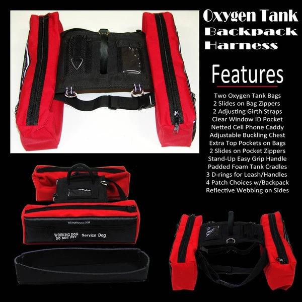 If you need to have portable oxygen with you this Oxygen Tank Backpack Harness is a must for you and your service dog. The Oxygen Tank Backpack Harness has a specific use as a carrier for oxygen cylinders. It features many functional elements as a backpack and dual purpose of being an Identification service dog vest.