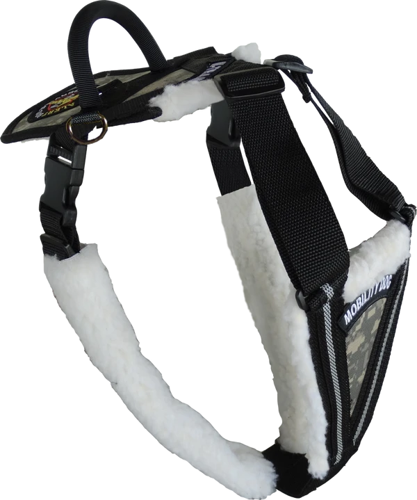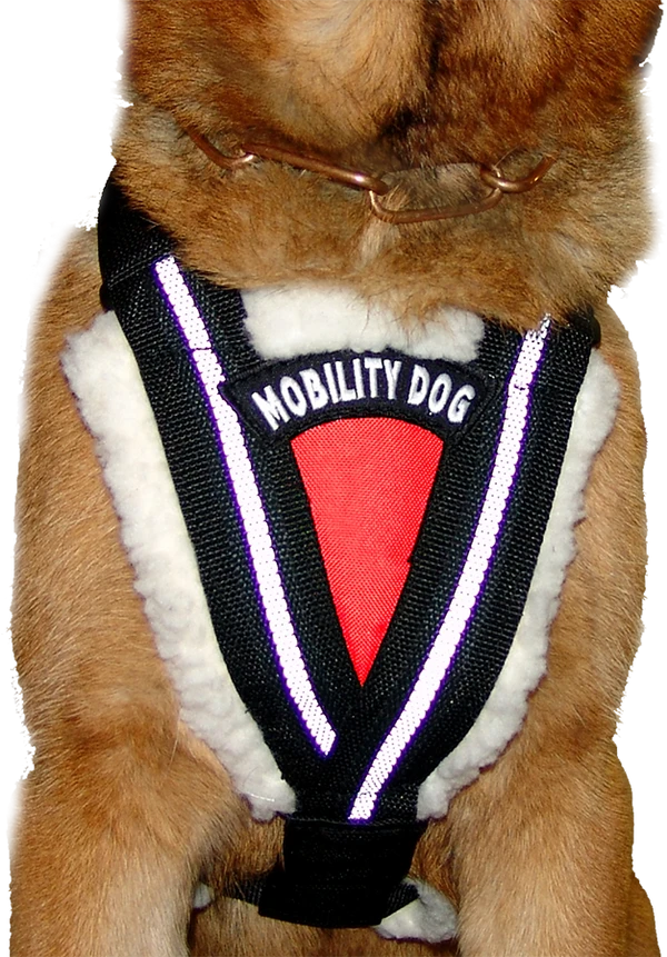 I start the training of very mobility dog with this style harness. Why, because it just works well, it’s light weight and the dog has good movement to begin having pressure and my balance on it’s shoulders. The design of this harness began with a need for a form fitting harness that stays upright on the dog while pulling a wheelchair and giving balance to the handler when they transition from the chair. A dog’s strength for pulling comes from the chest and our Pulling & Balance Harness is a safe and effective way to utilize that power. Unlike pulling a wheelchair that is attached to the dog’s collar this harness takes the stress away from the dog’s neck and it is much safer for the dog.