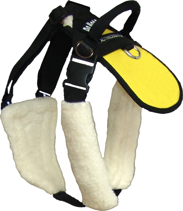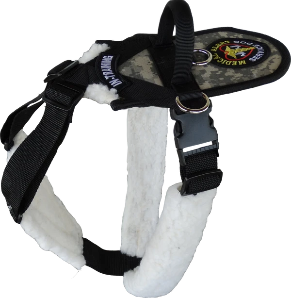 The front chest straps have double adjustments. The girth has two side release buckles and adjusting slides. All the stress points on the dog are padded. The underside of both the back plate and chest plate are felted, and then covered with sherpa. The girth strap has two removable washable sherpa covers. The back and chest plates are covered on the top with rugged 1000 denier materials.