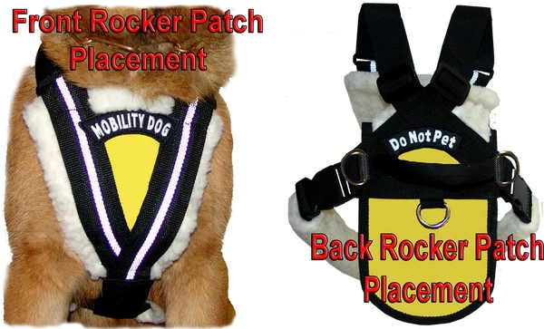 There is a non-restricting back plate on the harness top to place an identification patch. It is big enough to fit one of our specialty patches. The Pulling & Balance Harness comes with two rocker patches. One rocker patch for the front of the harness and the other for the top of the harness (patches shown in photos). Any specialty patches are an extra option.