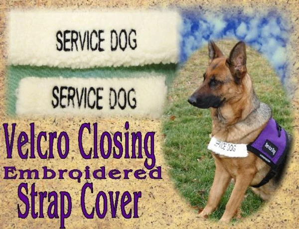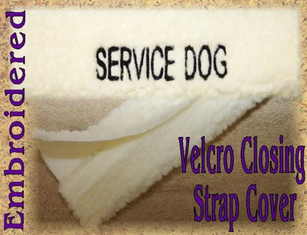The hook and loop closing embroidered strap cover is made from a soft, man-made sheepskin material. The hook & loop closure allows you to open the strap cover and wrap it around the chest or girth strap or handle of your dog’s vest.