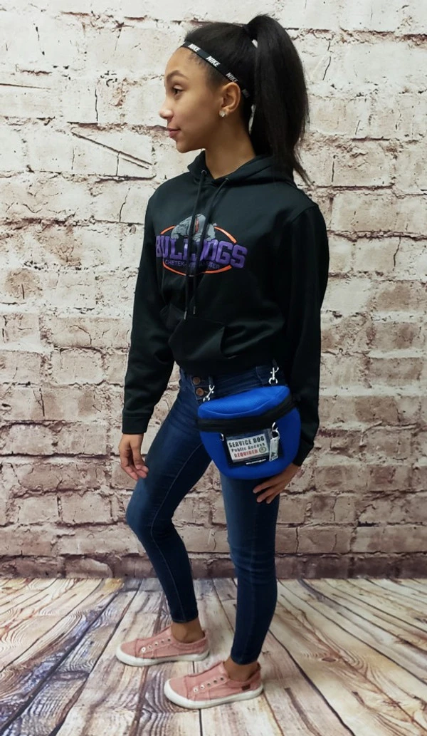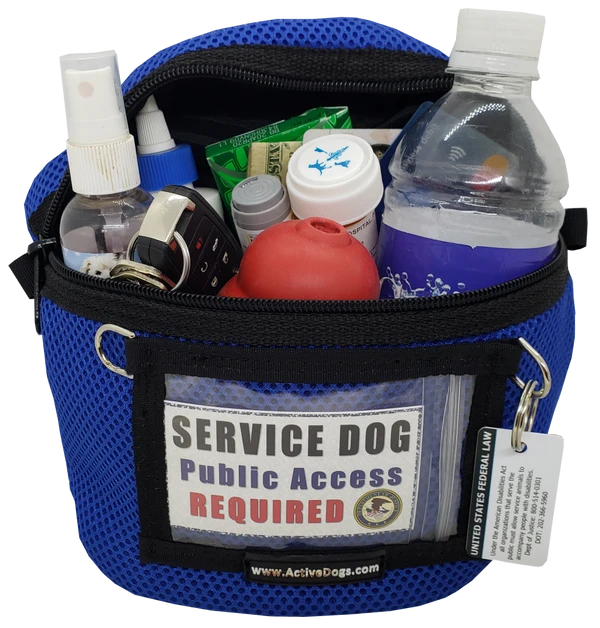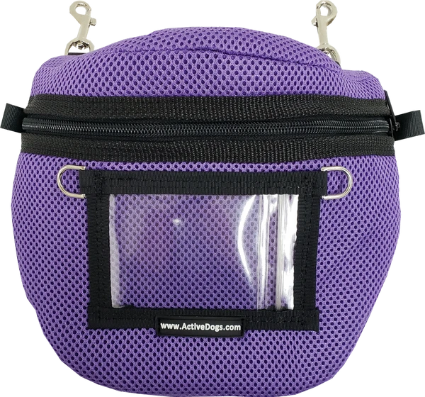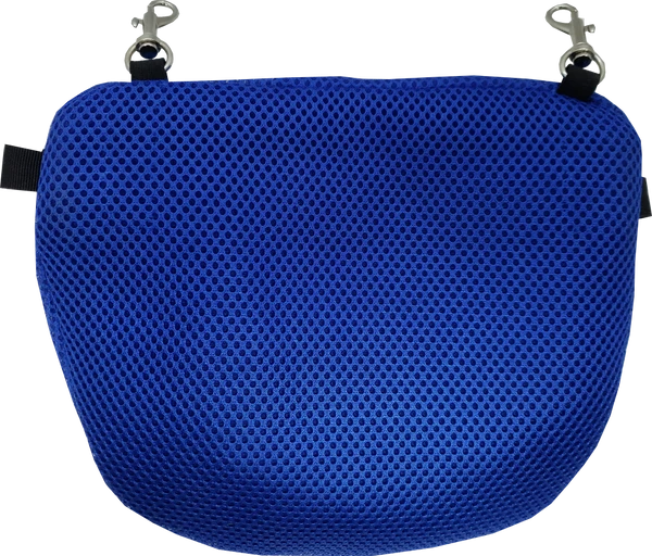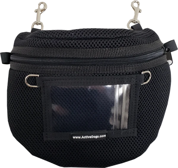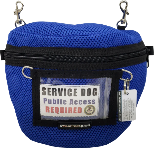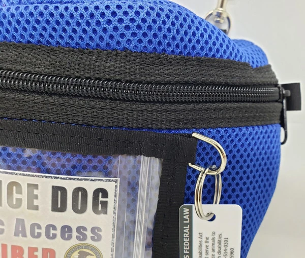 Our Spacer Mesh Service Dog Clip-On Back Bag w/ Clear Window was designed with a contoured shape so it aligns well with the shape of our vests and eliminates extra bulk that a square style bag gives. This bag is made with heavy poly/nylon fabric and is completely lined for easy cleaning & extra durability. This bag can easily be attached on the back or sides of any of our service dog vests or harnesses that have D-rings on them. This contoured style of bag has an expanded top where the zipper is located so it is very easy to open and get into. Finger tabs on each side of the zipper make opening and closing this bag a breeze. The front has a seal-able clear ID window pocket for displaying your identification or patch of your choice. There are two small D-rings located on the front of the bag to clip-on additional small items that need a place to hang with quick access. Easily attach this bag to any variety of items with the two bolt snap style clips located on top. This bag can be clipped onto any vests, harnesses, backpacks, belt loops, carry tote, wheelchair, ect..