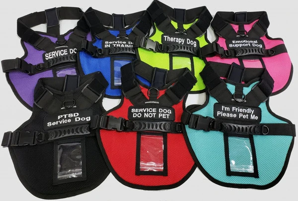 There are many features on the Spacer Mesh Cushion Comfort Service Dog Vest. Clear closable window pocket, molded handle, 3 metal D-rings, etc. are some of its features. This vest will accommodate a bridge handle (sold separately). Patches, Patches, Patches, many patches can be used on this vest for identification. The shoulder/chest straps are Velcro and will fit the 2×6, 2×4, or 1.5×3.5 Velcro backed patches. The vest comes with a hook & loop backed 2×6 patch above the handle. There is room on both sides of the vest for additional patches or specialty patches, (sold separately). The Spacer Mesh Cushion Comfort Service Dog Vest comes in two sizes, 22-30” girth or 31-46” girth. It is offered in 7 beautiful rich colors, Red, Blue, Purple, Aqua, Lime, Pink, and Black.