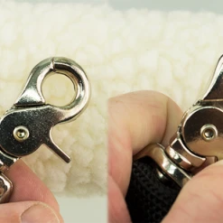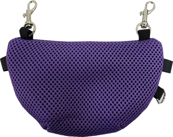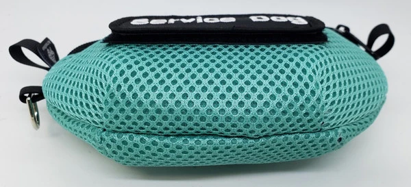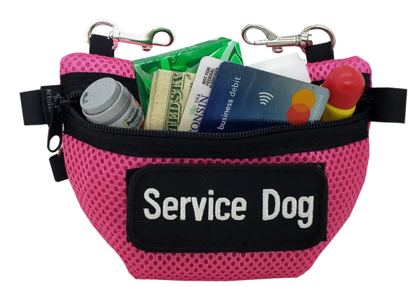 The Spacer Mesh Vest Clip-On Small Bag measures 7” wide, 5” long, and can expand 2” at the bottom. This bag has two small bolt snap style clips on the top for attaching the bag. They are very easy to open and close. The bag can also be worn on the handler pants belt loops or clipped to a variety of items such as backpacks, wheelchairs, totes, etc.