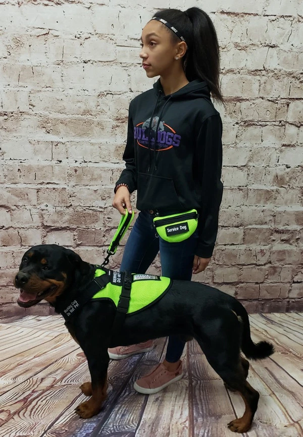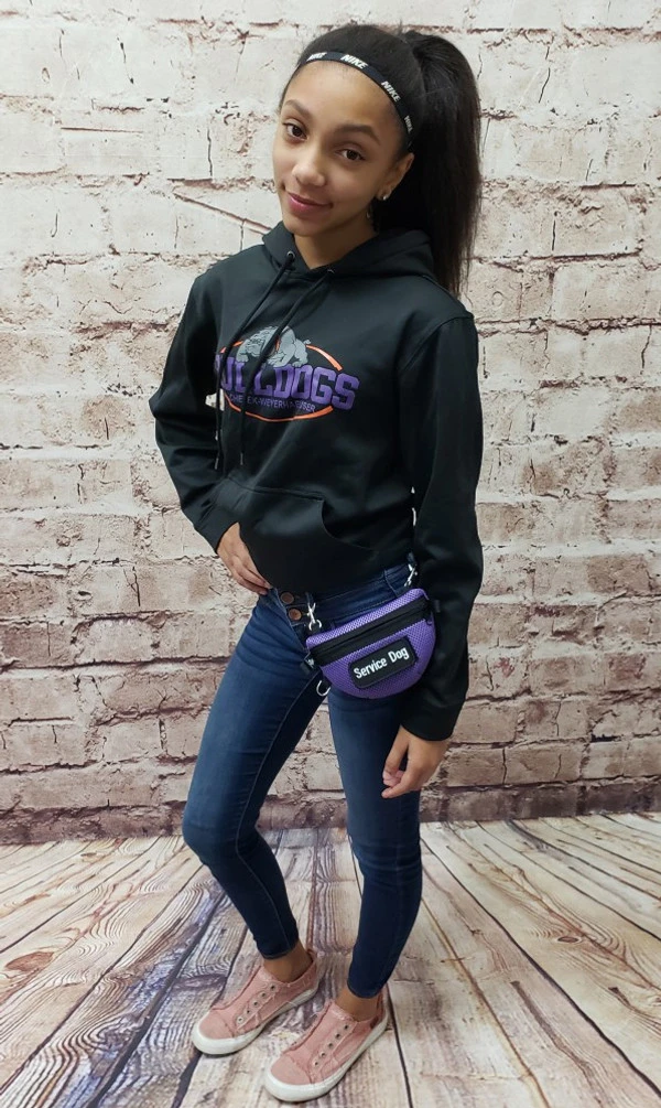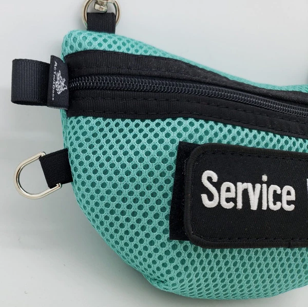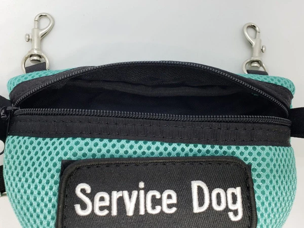 A zipper is located on the bags front top side so it is easy to access. The zipper has a long finger tab for comfortable operation and thumb tabs on both ends of the zipper making opening and closing the bag easy. The Service Dog Clip-On Small Bag comes in 13 colors and is a quality American made product.