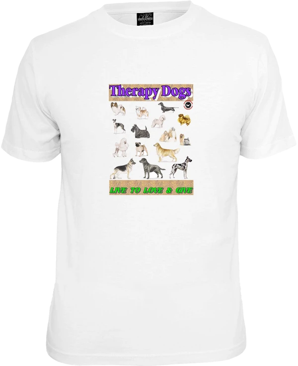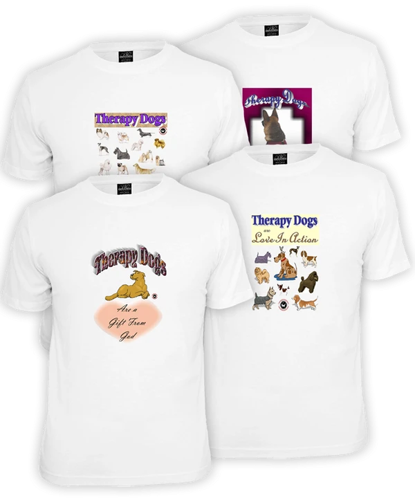 Our Therapy Dog T-shirts are available in four sizes and four different designs. They are a 100% polyester. The designs are permanent dyed. These T-shirts are durable, washable, and dry beautifully.