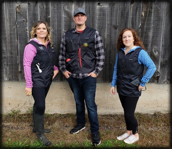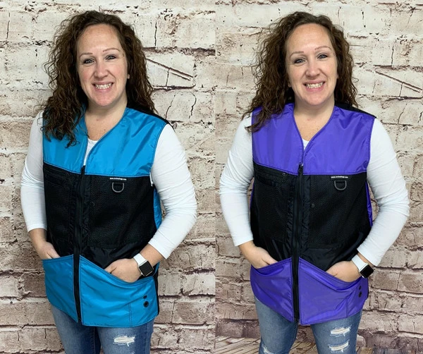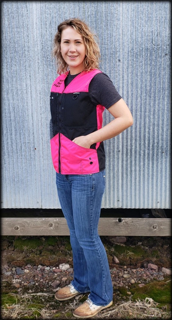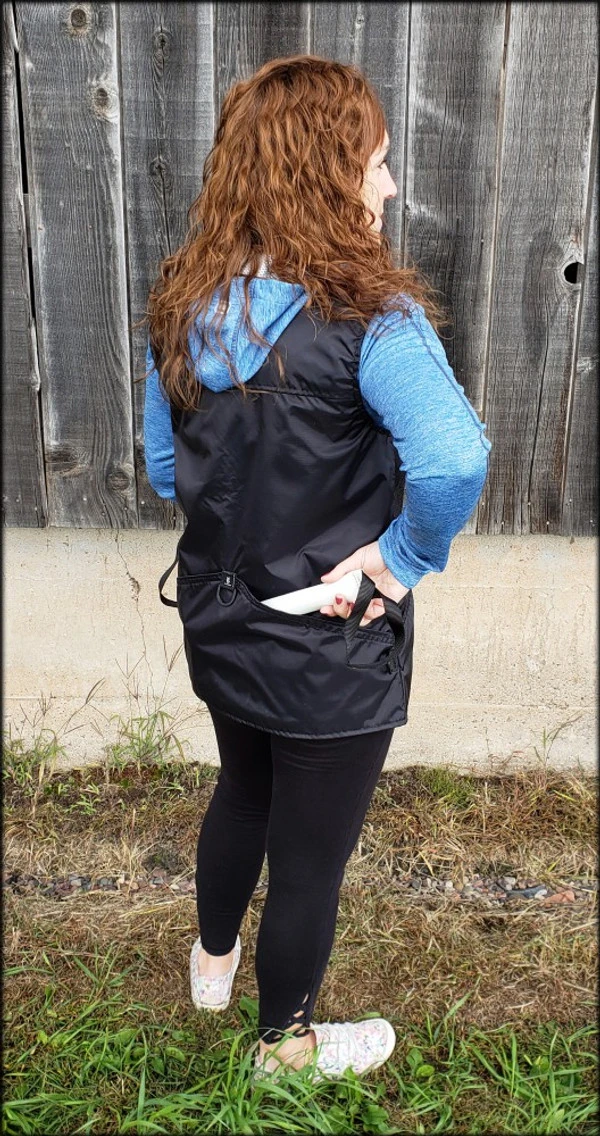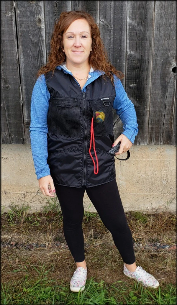 This vest was designed with a specific purpose in mind. I not only required storage in my handler vest but I wanted identification. When I am in public training a service dog I have often thought I should design an embroidered back handler vest stating “Service Dog Trainer” so people will not disrupt me while I am training. The Trainers Choice Embroidered Handler Vest does just that. This vest comes embroidered if you choose or you can have it with no embroidery. It is light weight without restriction in the neck and armhole areas so you have easy movement. It is fully lined, no scratchy seams and has a full front molded zipper. Another issue is always that pesky dog hair but dog hair dose not stick to this fabric. The vest is easily cleaned by wiping off with damp towel. Lots of pockets and D-rings on this vest, you can never have too many storage pockets. There are 7 pockets on this vest. The back has a full width pocket that can be accessed from either side, with a top center D-ring. I like this D-ring for hanging of a short pull tab or a small tug. On the front of the vest there are two large lower pockets. The top area of the vest has a great side opening mesh pocket, this works well for draping a tug or roped ball and letting the dog see it for motivation. On that same mesh pocket there is another D-ring at the top, this can be used for the same purpose. It also works great to hang a remote controller. The other side of the top has a double pocket. A mesh pocket with top opening, this is where I put my phone so I can easily hear and see it. Behind that mesh pocket is a zippered pocket, a good feature if you want to secure keys or smaller loose items. One of the best features of this vest is the built in poop bag holder. The bags are easily accessible from the vest exterior. Convenient to load on the vest lower left side. The lower right side of the vest has another D-ring. This work for hooking your leash. We will custom embroider this vest for you. You can have your text and/or logo put on the vest front. The Trainers Choice Embroidered Handler Vest is black in color and comes in five sizes. USA MADE