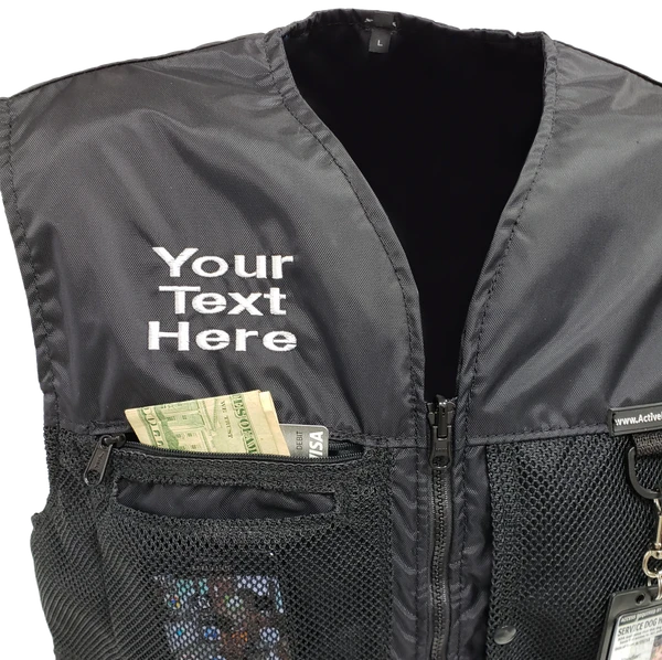 You can choose to have text or a logo embroidered on the either the left or right side of the front of the vest. A custom logo will also require a digitizing fee.
