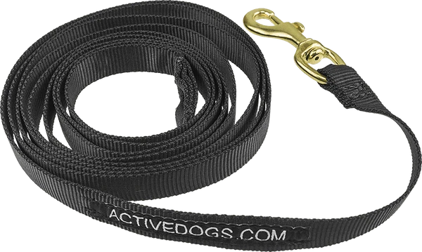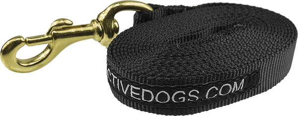 Super strong super durable tubular nylon drag lines with brass hardware will last a lifetime. The activegos.com tubular line is a double layer of nylon. Our nylon lines are 3/4” wide and are made from a tubular webbing making them light weight. Tubular webbing is woven in a continuous circle and when pressed it gives the webbing two layers and this is where the strength comes from. Nylon webbing is more rot resistant than other webbings which causes it to be very durable and have a long use life. We use quality brass bolt snaps on these lines and box-tac stitch them into the lines for secure work use. There is no handle on the drag lines so that the drag line can be easily slipped through your hand while training or working your dog. MADE IN THE USA