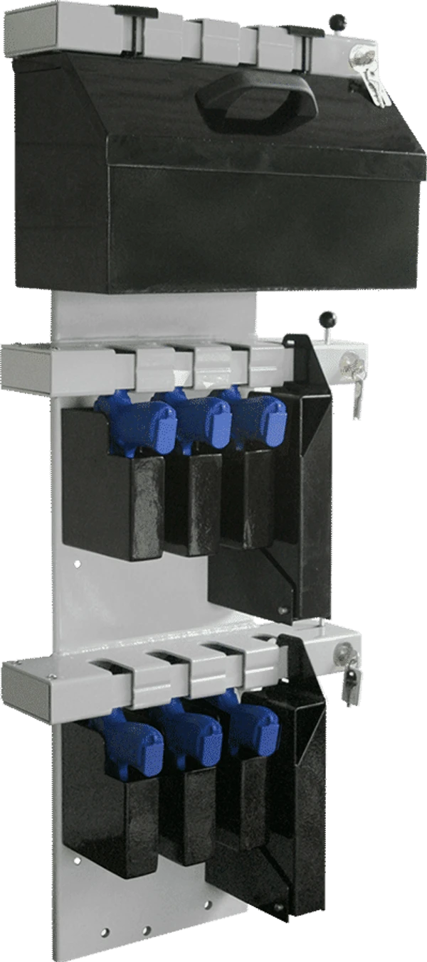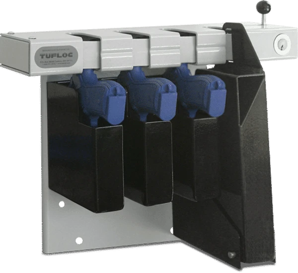 The Quad Racks are customizable with different pockets for different type of weapons. They can hold anything from a shotgun to an M16 to a pistol. There are also pockets for storing ammo and accessories. They can be free standing with the standard or long stand; otherwise they can be bolted onto the wall. Pocket sold separately. Standard Stand used with 4 Guns (Standard Back Plate) and the Long Stand used with 4 Guns (Long Back Plate)