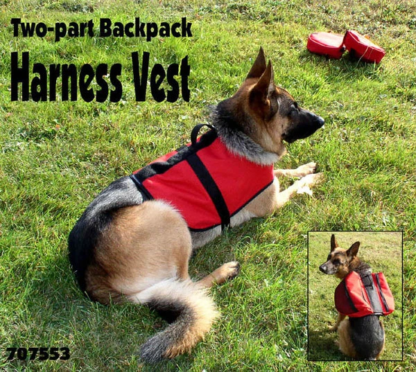 The large backpack side closes with a zipper. There is a nylon netting see through outer pouch on each side. This is great for carrying your Frisbee or items that you frequently require. The backpacks are designed to fit over the handle and D-ring so that both the D-ring and handle can be used while the backpacks are attached to the harness. The backpack bags are large approximately 10”x13” and expand 3”. The rounded flowing design of the bottom of these backpacks makes them a more functional and safer design. There are no flopping belts on this backpack harness vest which tend to catch on objects. This 2 piece Backpack Harness Vest is made to carry lots of stuff and is a workhorse for traveling. Made in the USA.