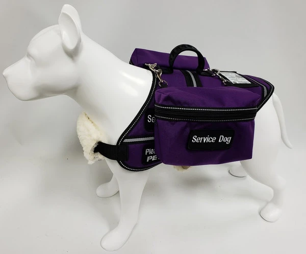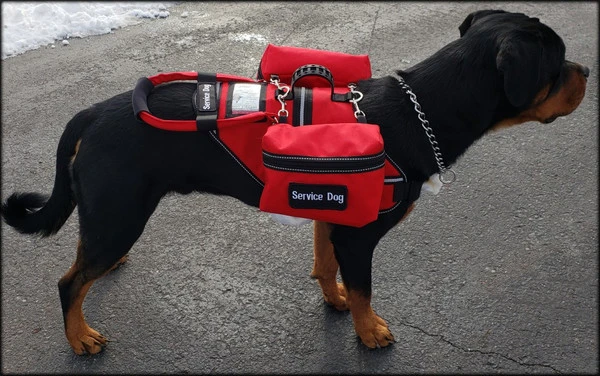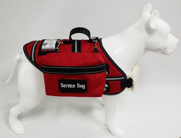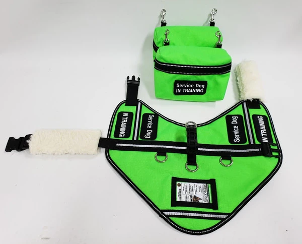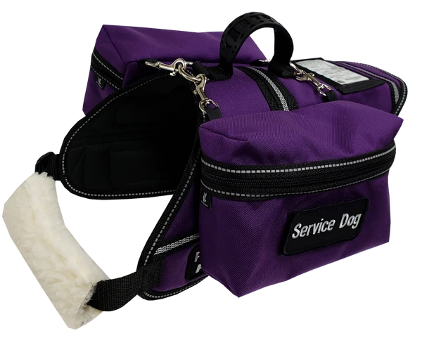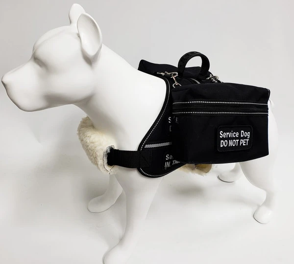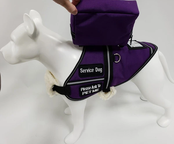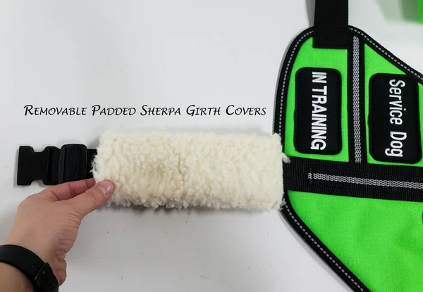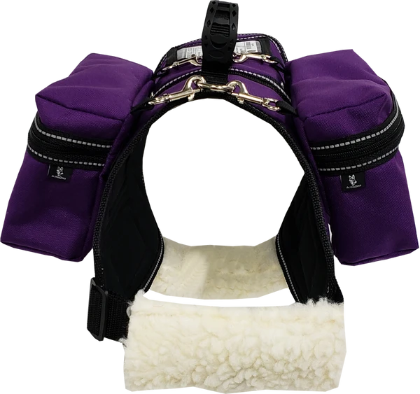 On the top back section of this vest is a vinyl window pocket to put your dog’s ID Badge with velcro closure to secure it in place. This window pocket will fit all ID Badges made by ActiveDogs. The rubber molded handle is placed vertical for comfort and easy access. There are 4 reflective strips on the vest and the entire vest and additional bags are bound in reflective webbing for maximum visibility & safety. There are 4 D-Rings on this vest to accommodate your bags, bridge handles, leash & other accessories. The girth and chest straps are 1.5” in width and come with padded removable sherpa covers, both are adjustable to get the best fit.